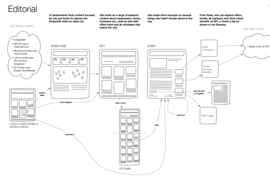City Guides: The first sketch shows the user experience, the second shows how it is supported.